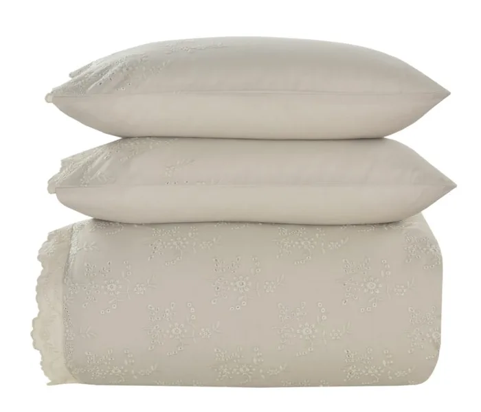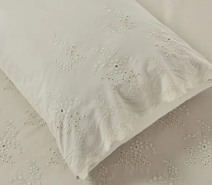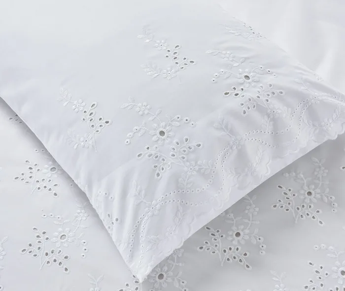 הסט מתאפיין בעיצוב נקי ומוקפד, המשלב רקמה אנגלית עשירה ואמנותית המעטרת את הציפה והציפיות.